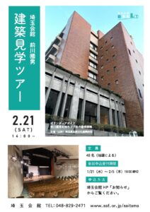 ◆内容:ボランティア・ガイド「前川國男を知ろう!彩の国探検隊」の皆さんのご案内により、埼玉会館の各所を巡り、前川建築の特徴と魅力を彩発見していただくイベントです。