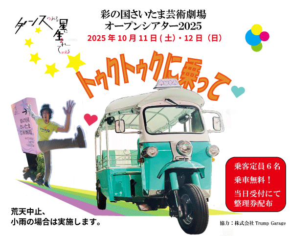 彩の国さいたま芸術劇場オープンシアター「ダンスのある星に生まれて2025」が10月11日(土)・12日(日)に開催。この2日間の屋外イベントとして、トゥクトゥク(三輪自動車)が、芸術劇場と与野本町駅前公園を行き来します。