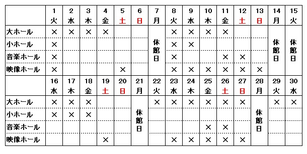※当劇場主催公演等の予定によりお申込みいただけない日程がございます。ホールの申込み可能日につきましては、一番下の表をご確認ください。