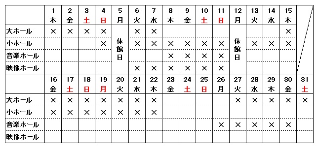※当劇場主催公演等の予定によりお申込みいただけない日程がございます。ホールの申込み可能日につきましては、一番下の表をご確認ください。
