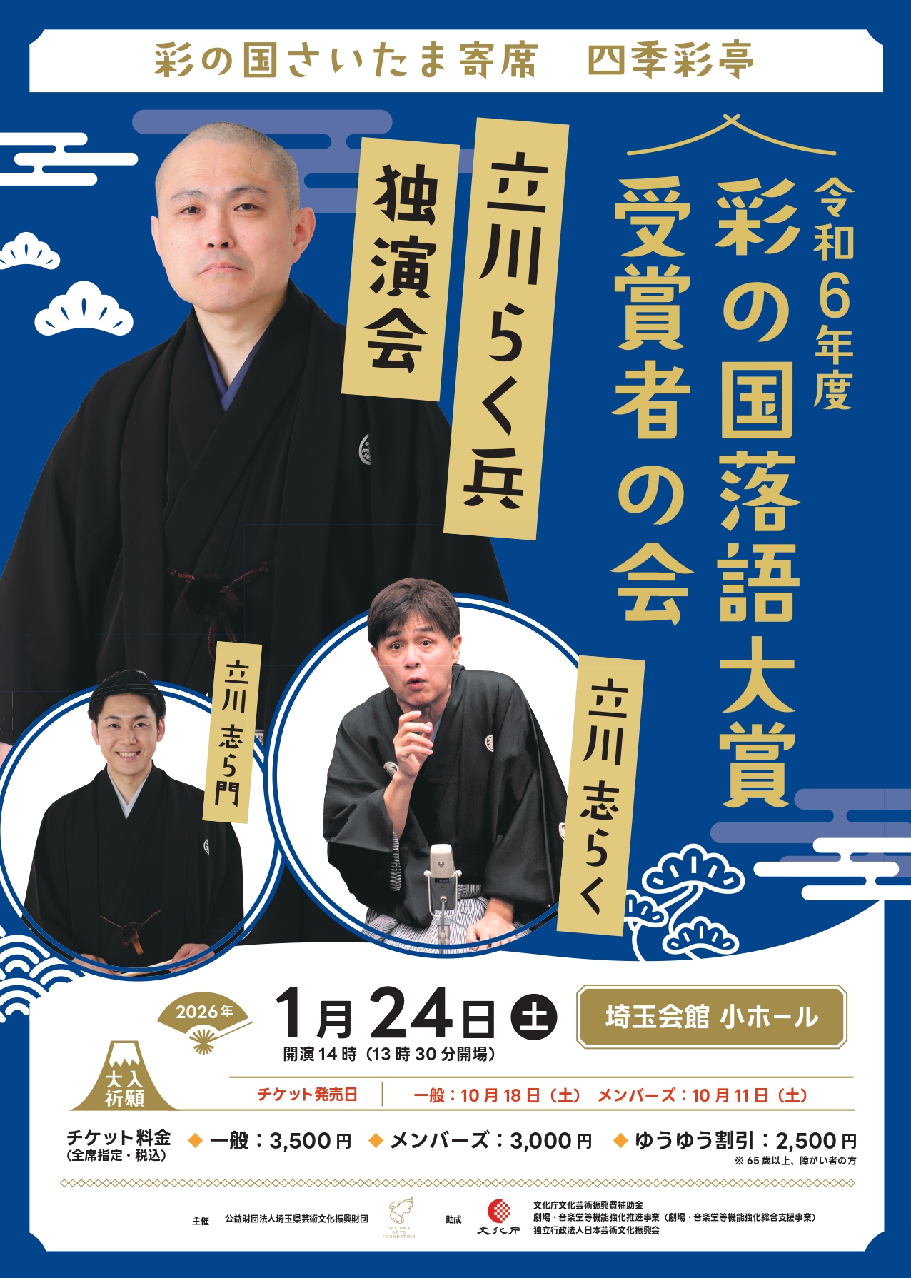 歴代の大賞受賞者は、埼玉県秩父市出身で「笑点」大喜利レギュラーの林家たい平に始まり、新作も古典も現代的なセンスで聴かせる柳家喬太郎、名人の系譜を受け継ぐ柳家三三、NHK Eテレ『落語ディーパー』での軽妙なトークも記憶に新しい春風亭一之輔など、現在はいずれも当代きっての人気・実力を兼ね備えた噺家となっており、将来の落語界のスターを生み出す場として、「彩の国落語大賞」が大いに注目されています。